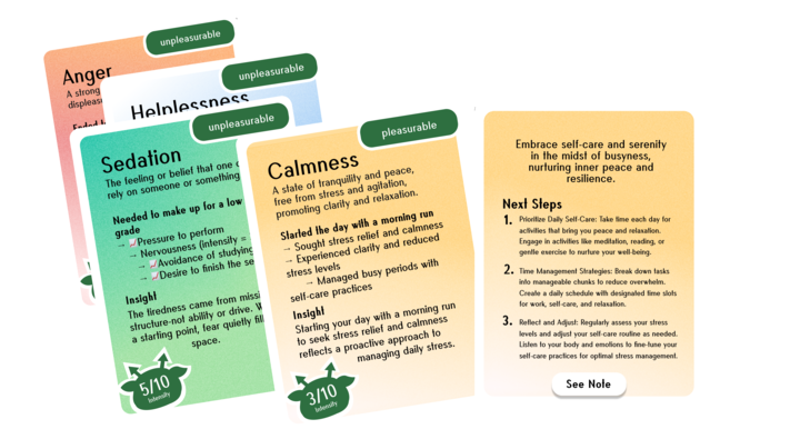 Your Emogram is a flippable card generated from your conversation with Alfie in Arrowz format, giving you insights into your emotions. It identifies and defines your primary emotion of the day. The card includes the intensity of your emotion and insights on your feelings. When you flip the card, you will see suggested next steps!